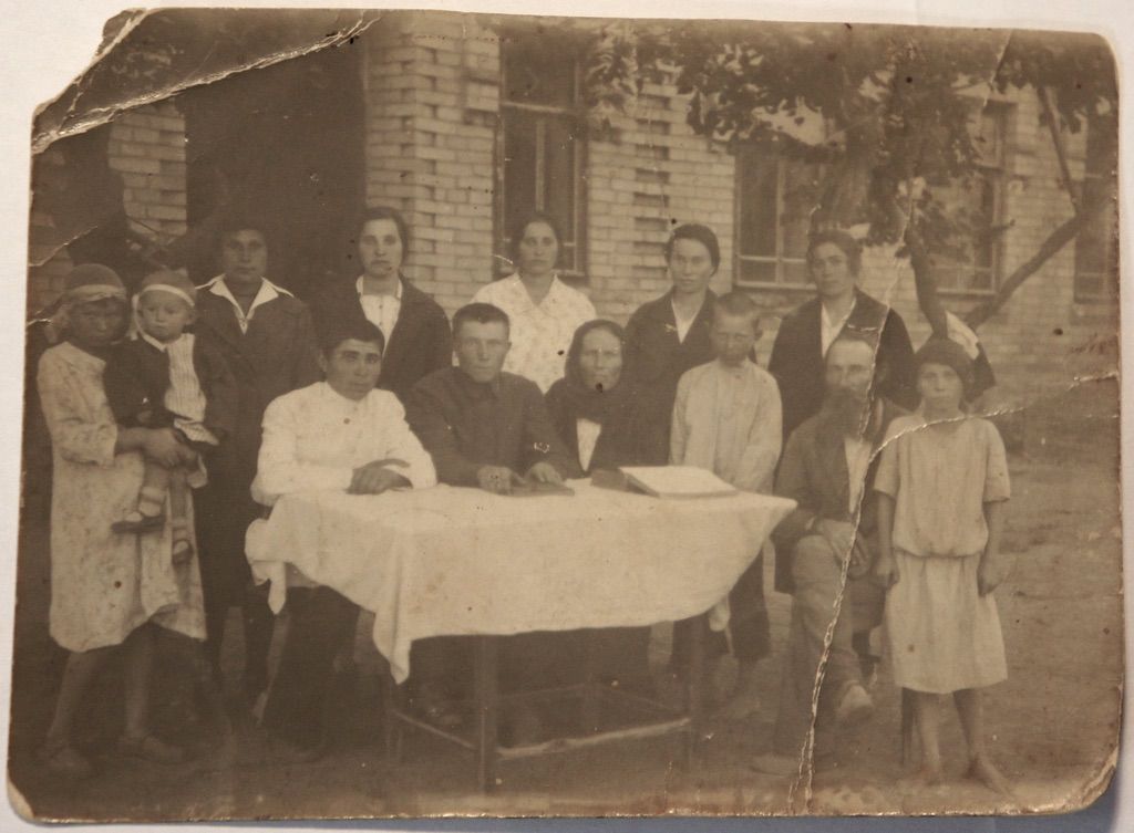 1920?, Яков Никитович Бобров с семьёй возле дома Бобровых с. Нововасильевка.