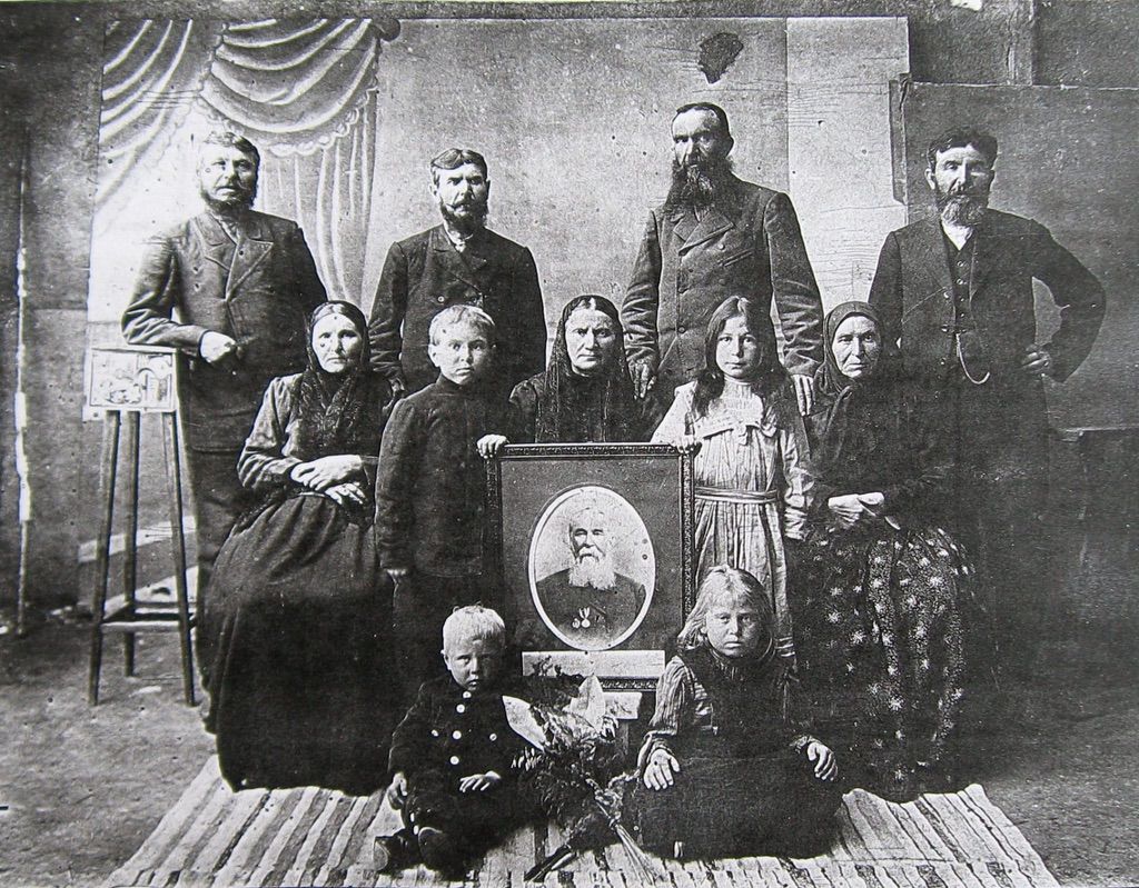 190?, Фото, на второй день после похорон Тимофея Алексеевича Сергеева (он на портрете) Стоят: Федор Тимофеевич, Андрей Тимофеевич, Тимофей Тимофеевич, Иван Тимофеевич Второй ряд: Анна Ивлевна (жена Андрея), Михаил Андреевич (сын Андрея), третья Ан…