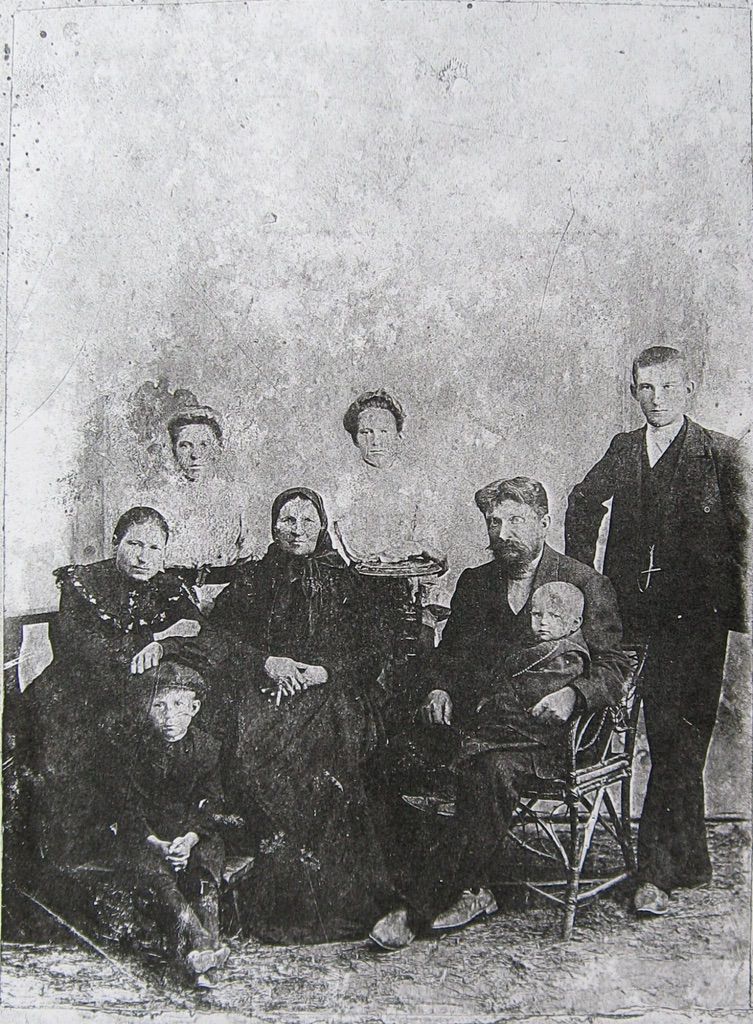 1907, Елена Емельяновна Калмыкова (Калмыкова), Андрей Иосифович Калмыков, Фекла ? ? (Калмыкова, Ячменева), Иосиф Иосифович Калмыков, у него на руках Василий Иосифович Калмыков. Стоят — Мария Иосифовна Калмыкова (Рудаметкина, Сергеева) и Полина И…