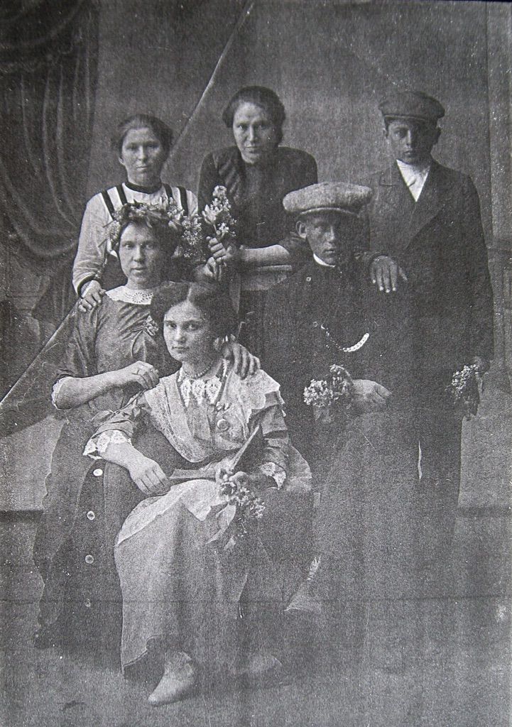 1913?, стоит ???, сидит ???, сидит Полина Иосифовна Калмыкова (Калмыкова), рядом сидит Евдокия (Душа) Ивановна Панкратова (дочь Марии Емельяновны Калмыковой (Панкратовой)), за ними стоят — Мария Иосифовна Калмыкова (Рудометкина, …