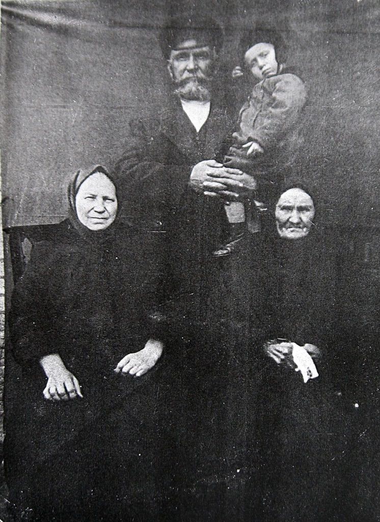 1925?, Елена Емельяновна Калмыкова (Калмыкова), Фекла ? ? (Калмыкова), стоит Иосиф Иосифович Калмыков с внуком Иосифом Андреевичем Калмыковым.…