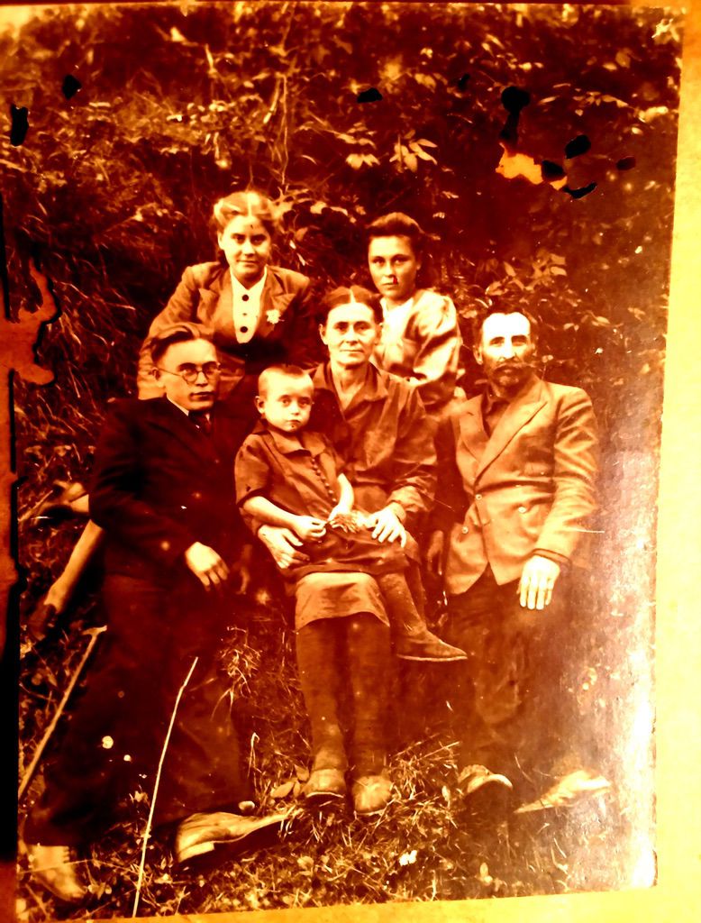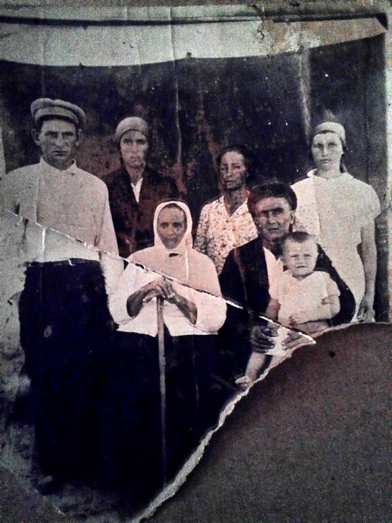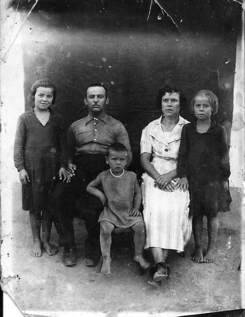 1923?, Справа на лево: Матрёна Николаевна Сергеева, Анна Сергеевна Закаличная, на переднем плане Степан Сергеевич Закаличный. Остальные Закаличные, одна из них Полина.…