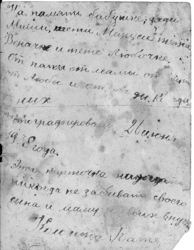 1938, 26 июня. Семья Колодина Владимира Романовича. «На память бабушке [прим. Ефимии - Химочке, жене деда Романа Ивановича Колодина], дяди Миши, тёти Маруси [Колодиным], тети Верачки [Вере Романовне Колодиной] и тете Любочке [Любови Романовне…
