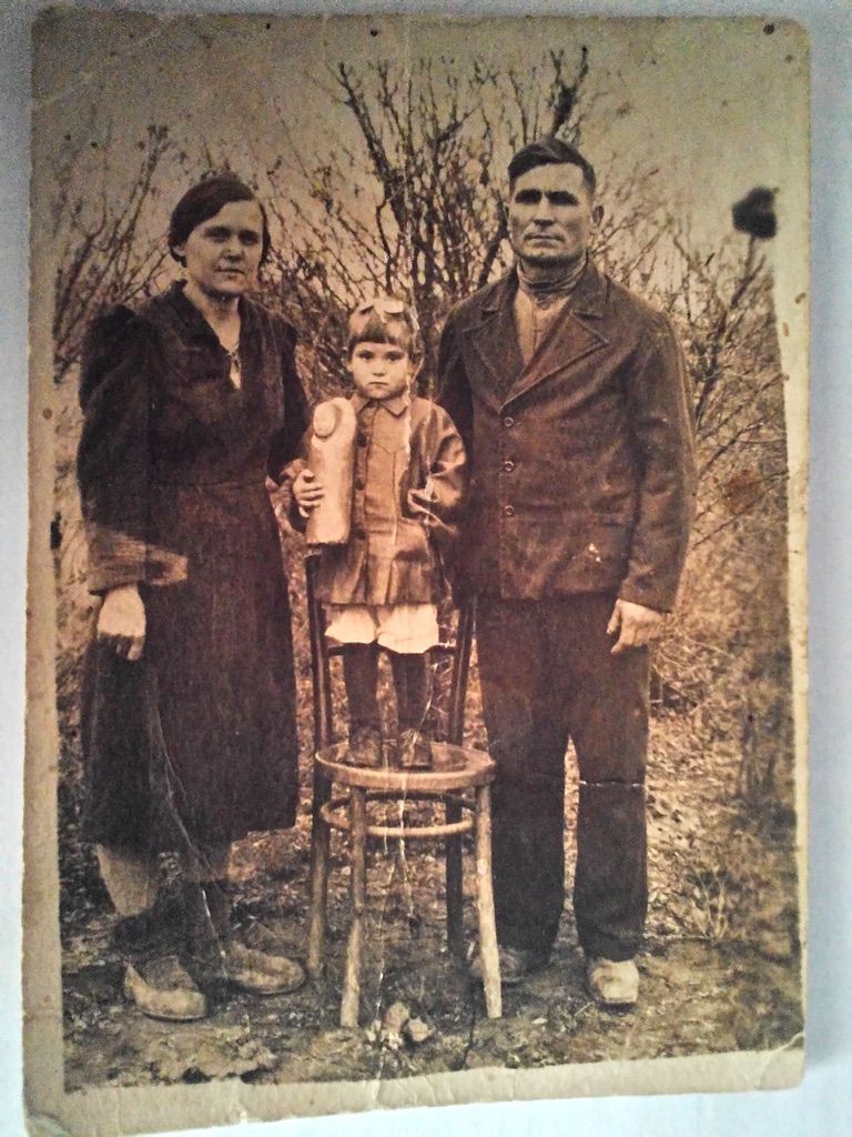 195?, Диментий Романович Колодин с приёмной дочерью Клавдией Диментиевной Колодиной и женой Варварой.
