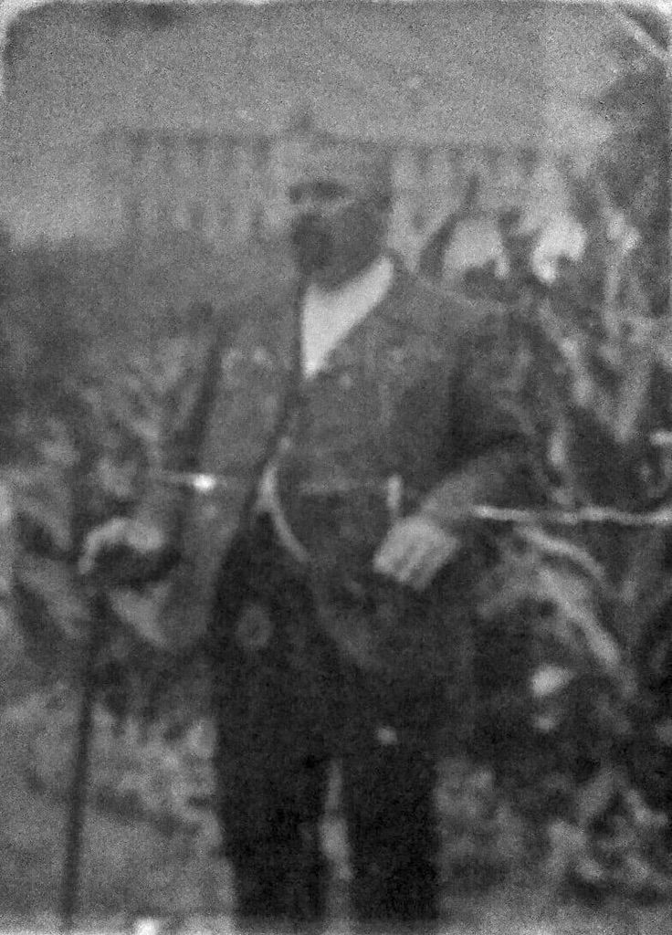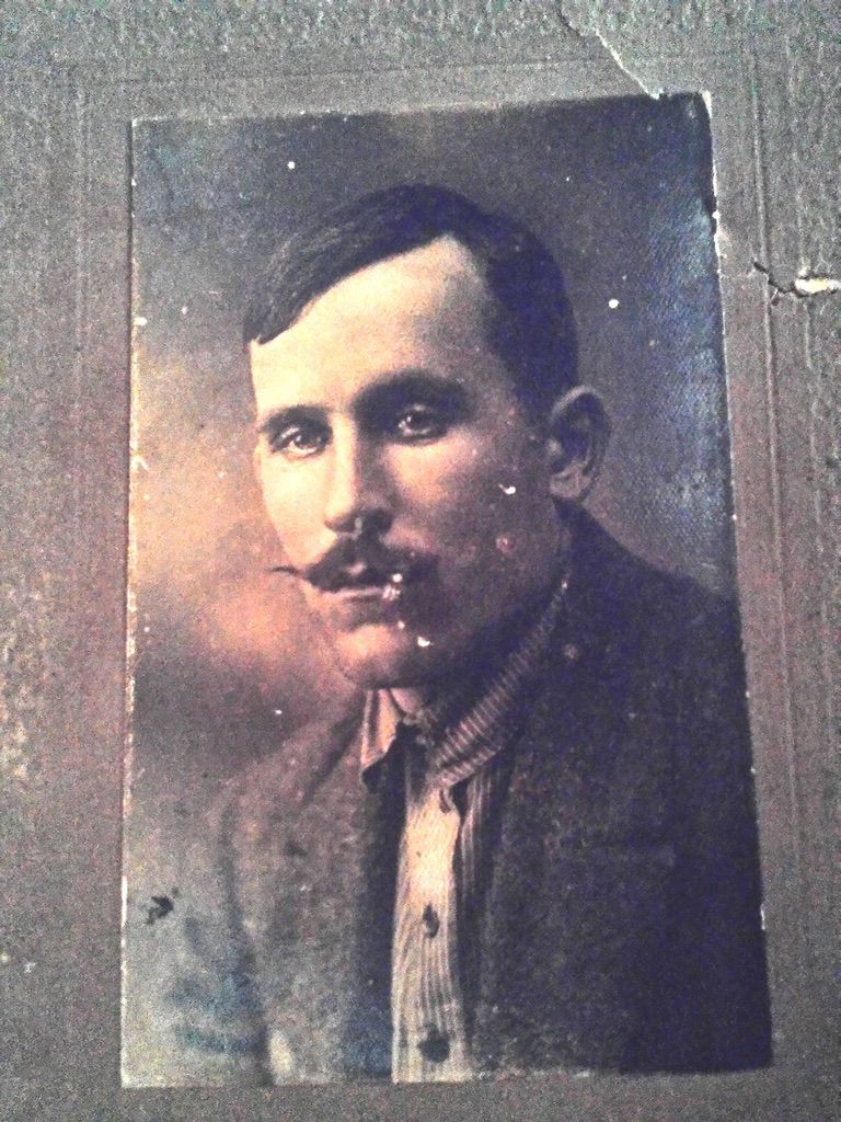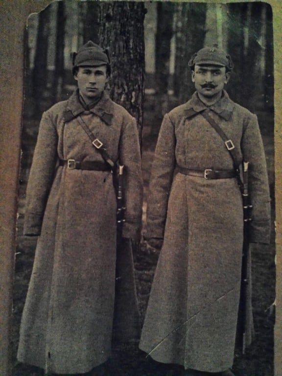 1917, Cправа (с усами) Иван Романович Колодин. Оборот: «На память Дорогим родителям: папе Роману Иван.[новичу] и маме Ефимии Григ.[орьевне] Колодиным, ваш сын Иван Колодин 1917 год 31 августа»…