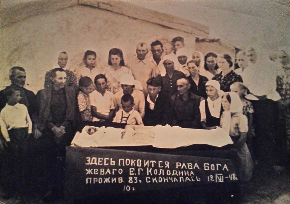 1926, Похороны Михаила Петровича Колодина. У гроба с бородой – отец умершего – Пётр Иванович Колодин. Семья Романа Ивановича Колодина: / Слева крайние, стоят снизу на верх сыновья: Владимир, Диментий, ?, ?, Пётр, Алексей, ?, ?. Далее жена Ефимия …