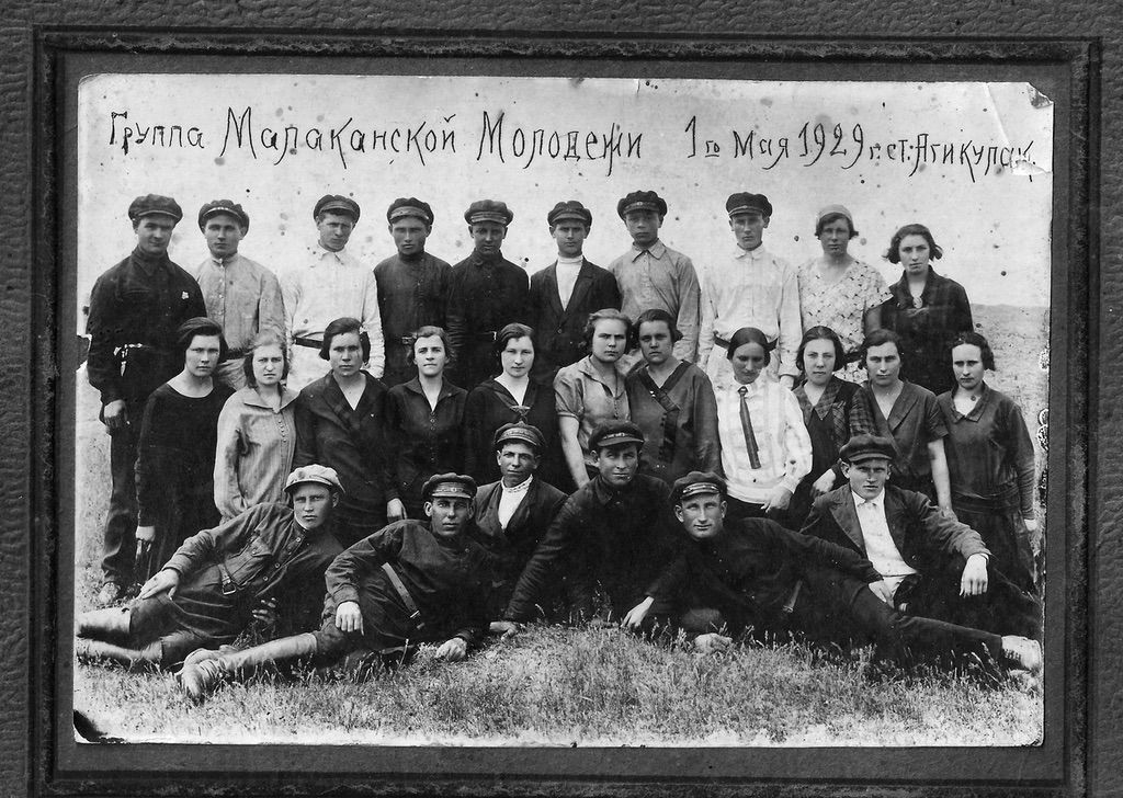 1929, 1 мая. Группа молоканской молодёжи Ачикулак. Слева, верх. ряд - 2-й Михаил Ник. Никитин, 3-й Сурков Николай, 6-й Алексей Ник. Никитин; сред. ряд - 4-я Мария Ник. Сергеева (по мужу Ерёменко), 6-я Вера (жена Суркова),…