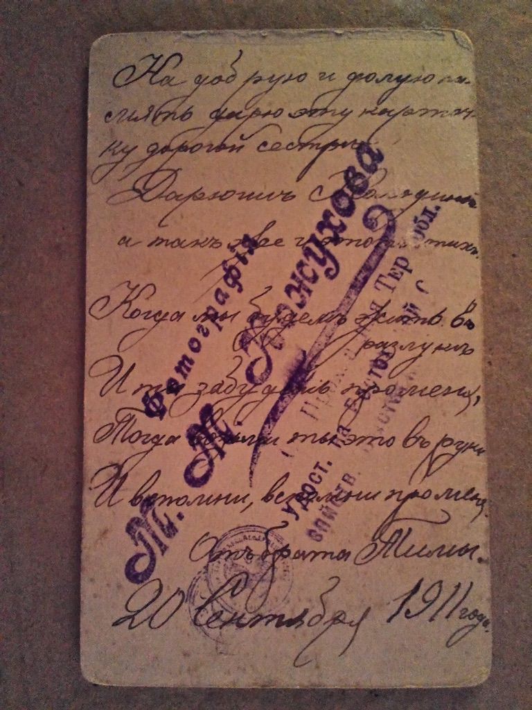 1911, 20 сентября. Артём Колодин. «На добрую и долгую па / мять дарю эту карточ / ку дорогой сестре / Дарюше Колодиной / и так же и этакие стихи / Когда мы будем жить в разлуке / И ты забудешь про меня / Тогда возьми ты это в руки / И в…