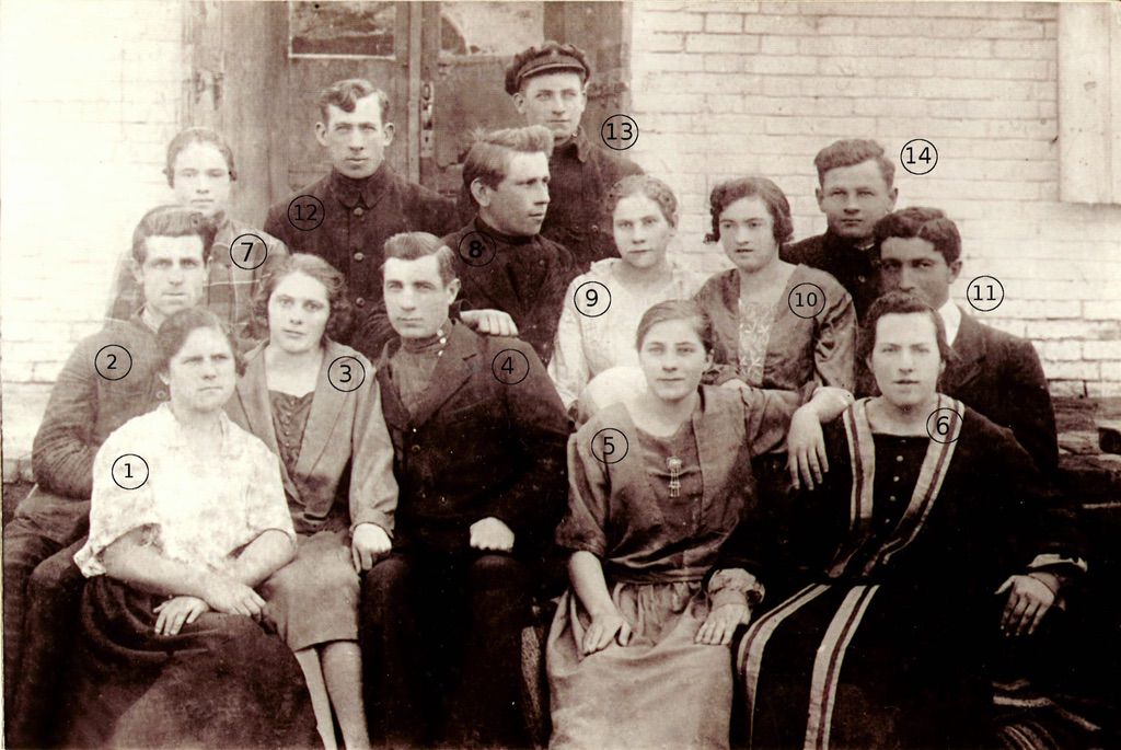 1924, Банк, Нововасильевка. (2) Пётр Афанасьевич Филатов (бухгалтер банка), (4) Василий Фёдорович Дымовский (зам. главного бухгалтера банка), (5) Маруся Фёдоровна Дымовская, (6) Мария Попова, (7) Мила, (8) Михаил Васильевич Попов, (9…
