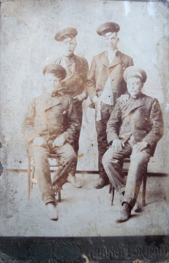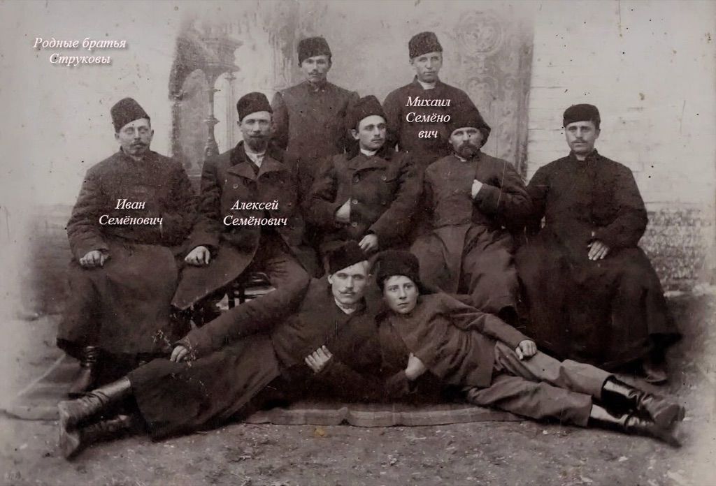 190?, Сидят (слева): Иван Семёнович Струков, Алексей Семёнович Струков; Стоит (справа): Михаил Семёнович Струков, [Ново-Васильевка]