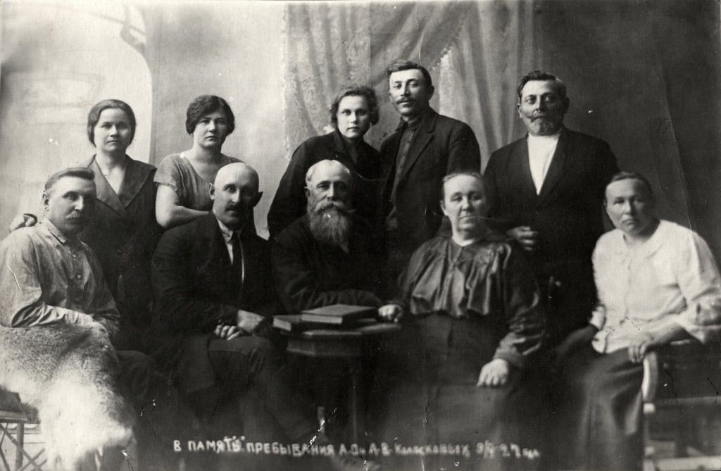 1927, за столом в центре Алексей Иосифович Колосков с женой, справа стоит Иван Семёнович Струков, рядом с Иваном — Василий Алекс. (родн. племянник) // «В память пребывания А.О. и А.В. Колосковых»…